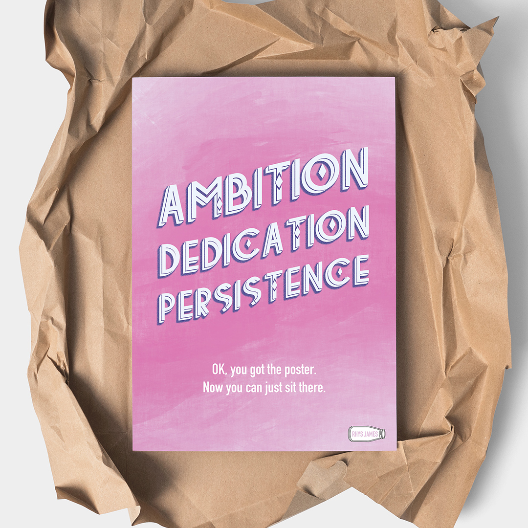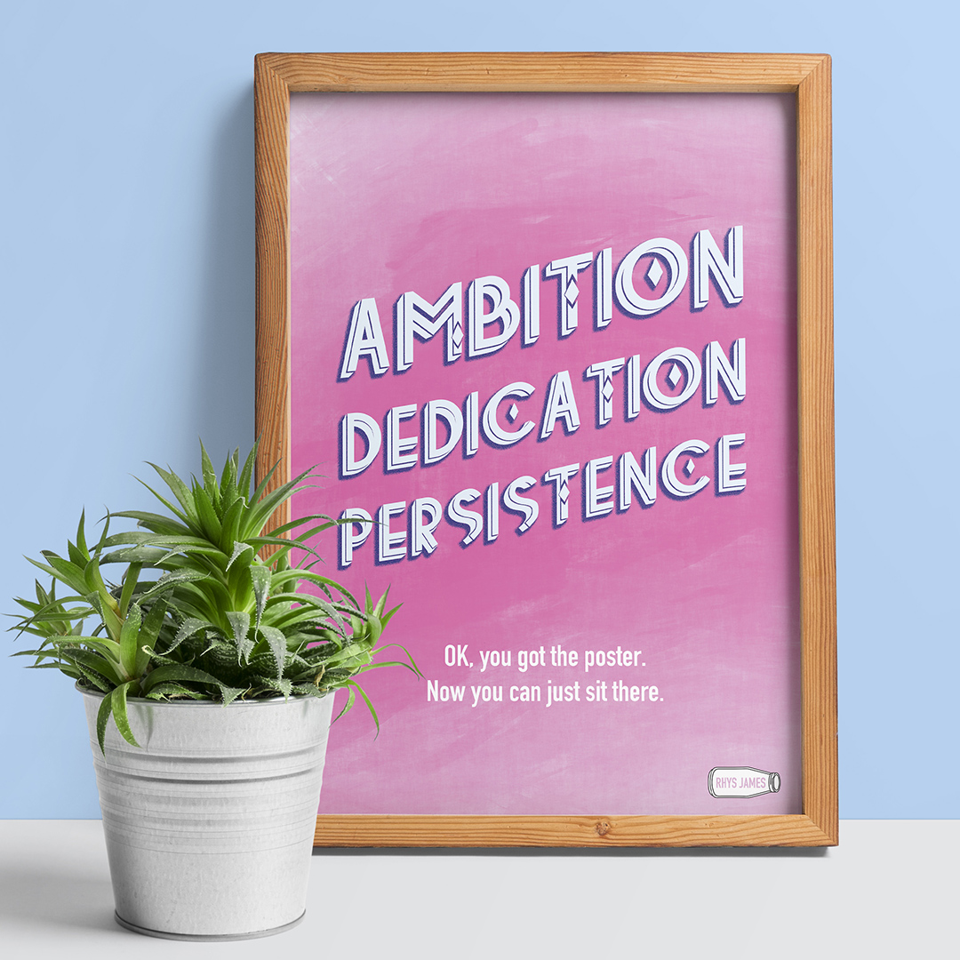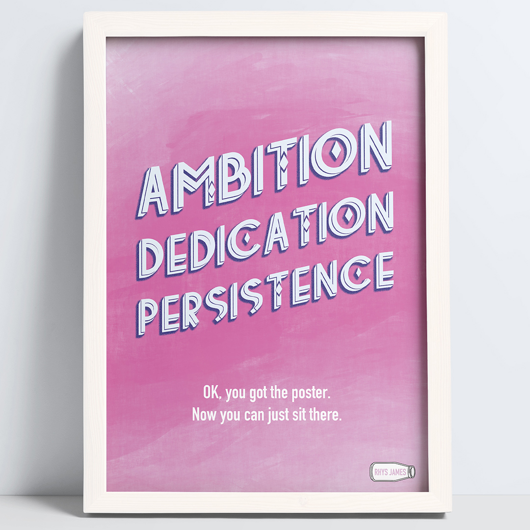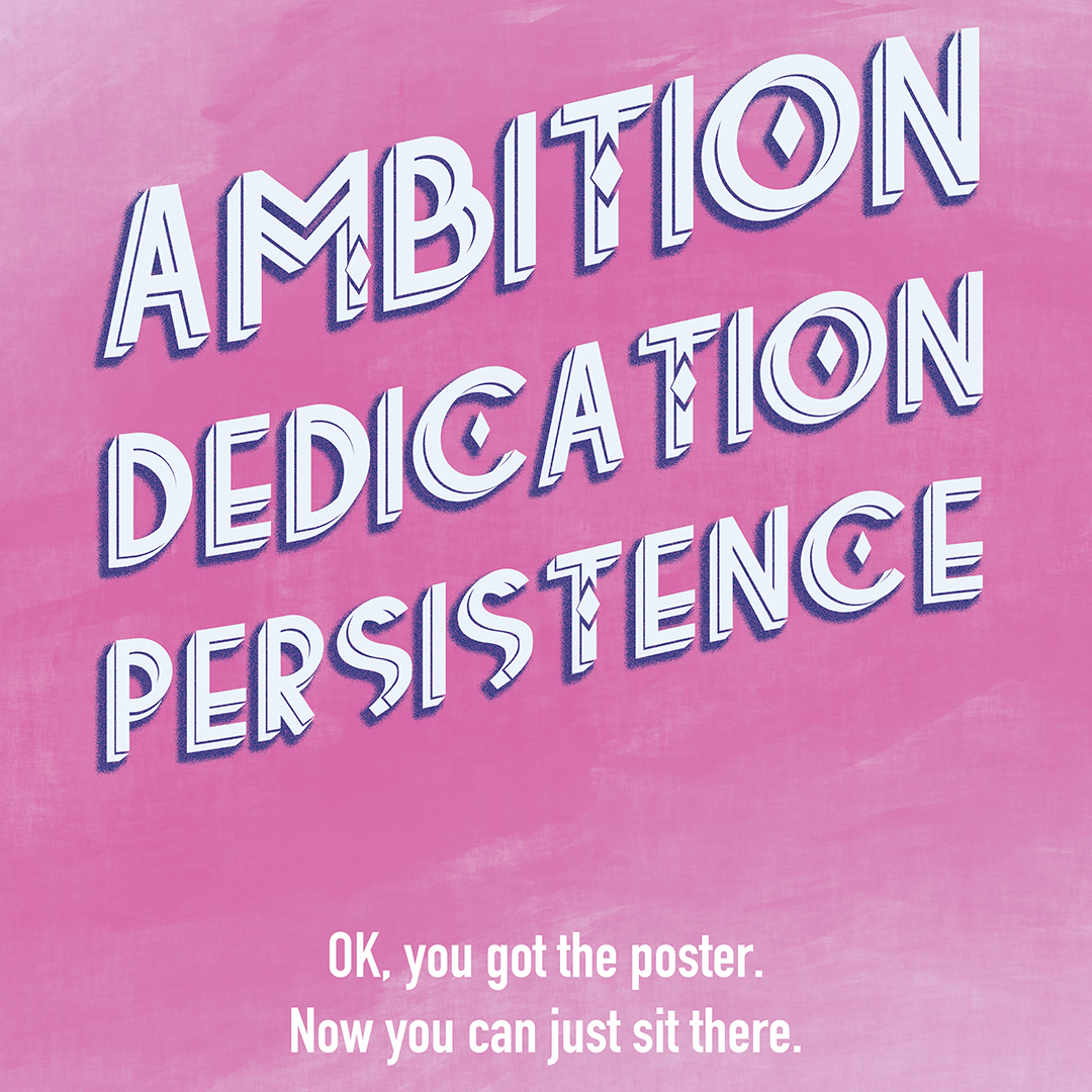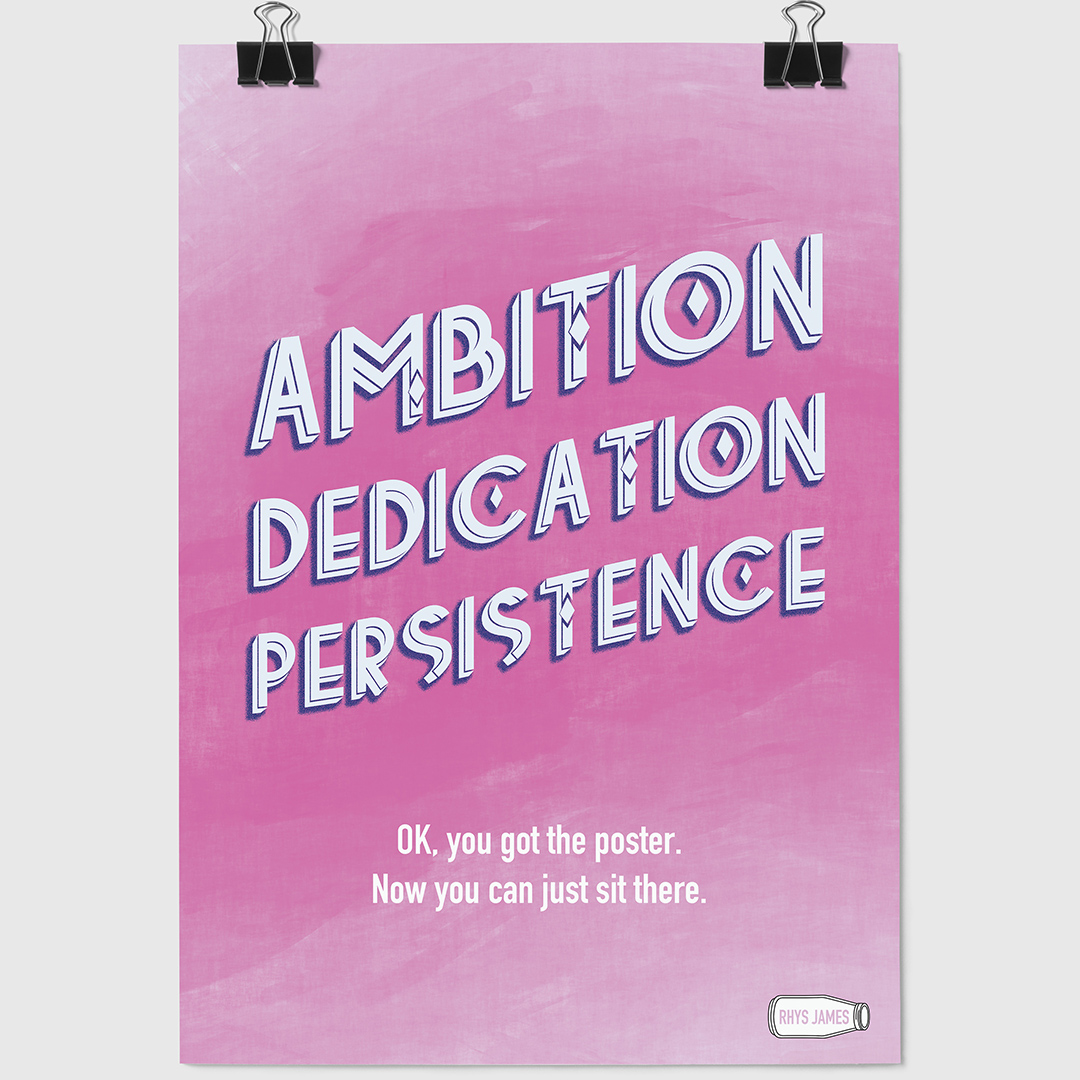 If you’ve ever seen a print in a friend’s house about how important it is to work hard, but you know them to be a useless, lazy worm. If you’ve ever wondered why you never see posters about determination and ambition in the labs and workshops of inventors and geniuses. If you find someone asking you to give 110% annoying, not just because it’s impossible, but because even 85% is a bit showy-offy, no? Well, this is the poster for you.